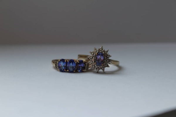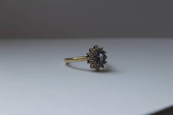 Teddy! Wow, what a showstopper 💜 A dazzling halo ring set with vibrant tanzanite and sparkling diamonds, crafted in 9k gold. She steals the spotlight instantly. Size 18. €469.-